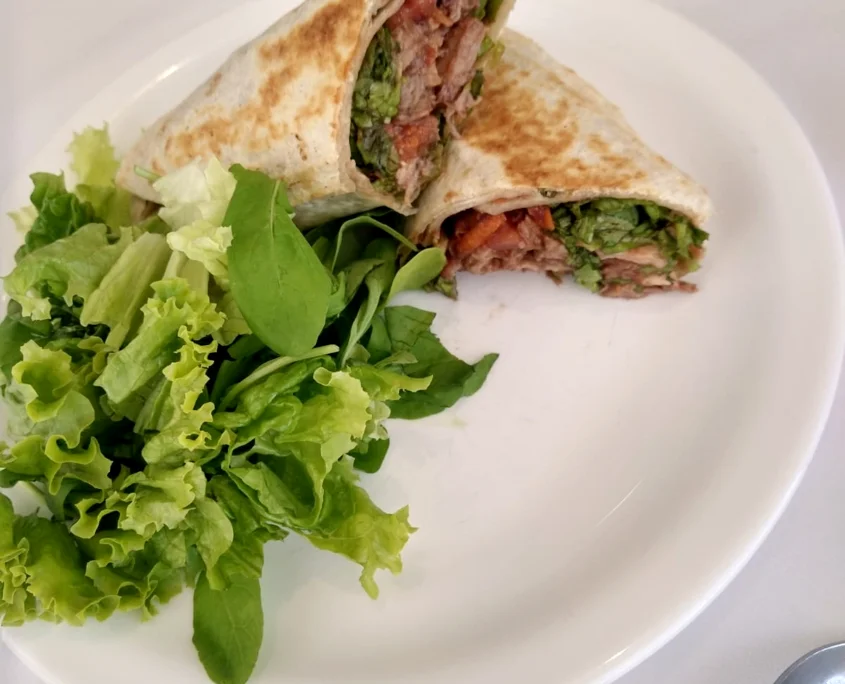 - Wrap de bondiola desmechada con cebolla caramelizada y rúcula